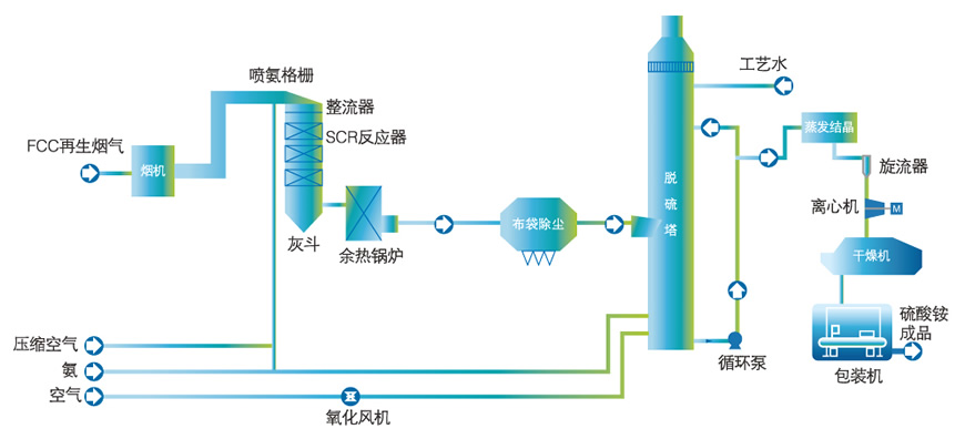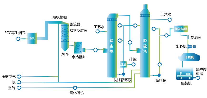 催化裂化的再生烟气经烟机、高温锅炉回收能量后,在300℃~420℃温度下进入SCR反应器,在催化剂作用下,烟气中的NOx与NH3反应生成N2和H2O;脱硝后烟气经低温锅炉回收热量后进入布袋除尘器,经布袋除尘后进入脱硫塔,脱硫后的净烟气经脱硫塔塔顶直排烟囱排放 。烟气中的二氧化硫在脱硫塔内被吸收 ,生成的亚硫酸铵溶液经氧化、浓缩,送入蒸发结晶系统,得到一定固含量的硫酸铵浆液。硫酸铵浆液再经旋流器 、离心机、干燥机后,得到水分<1%的硫酸铵,再进入包装机包装,得到产品硫酸铵。工艺过程无废水排放。