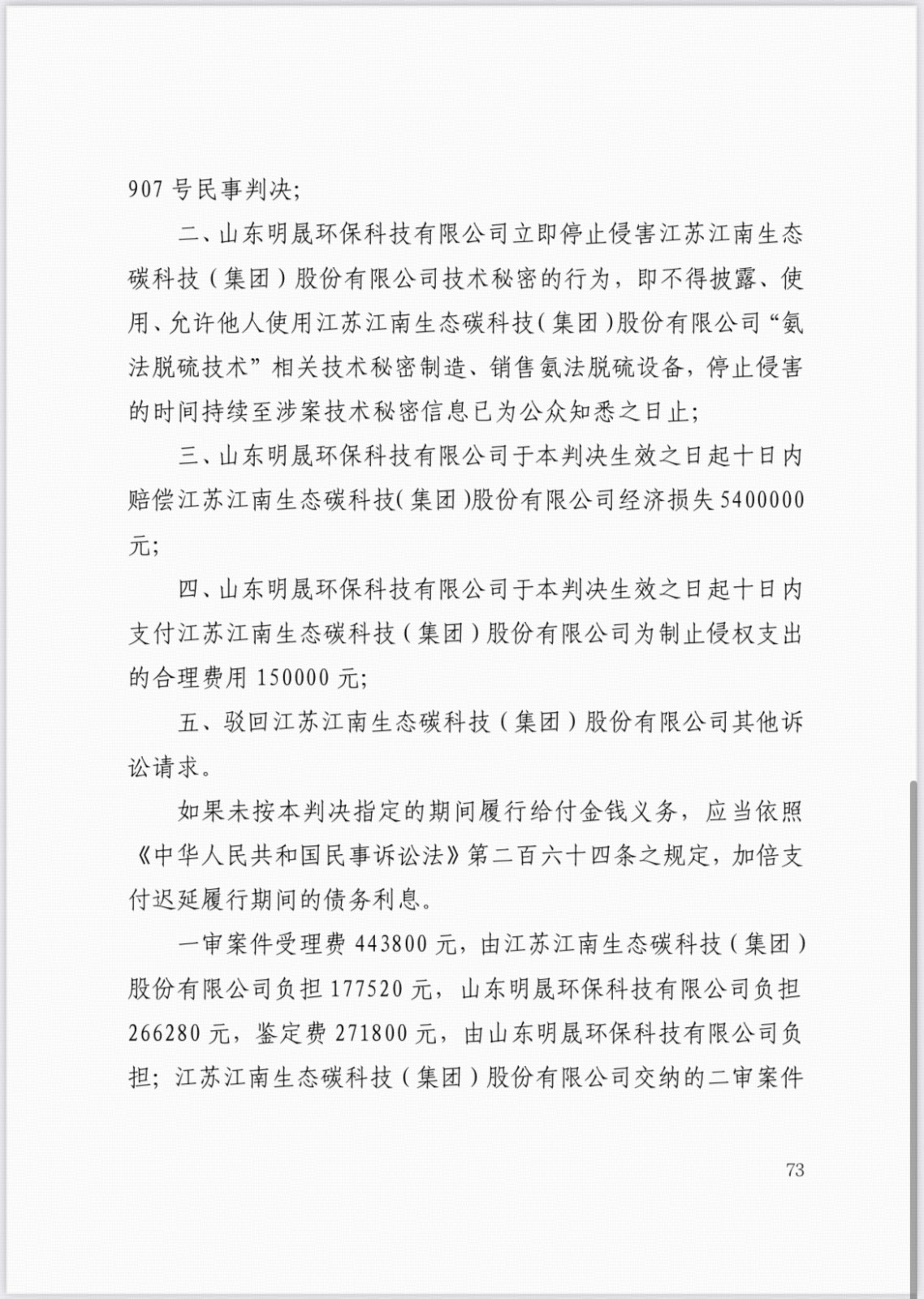 山东明晟环保科技有限公司立即停止侵害江苏尊龙凯时生态碳科技(集团)股份有限公司技术秘密的行为,即不得披露、使用、允许他人使用江苏尊龙凯时生态碳科技(集团)股份有限公司“氨法脱硫技术”相关技术秘密制造、销售氨法脱硫设备,停止侵害的时间持续至涉案技术秘密信息已为公众知悉之日止;山东明晟环保科技有限公司于本判决生效之日起十日内赔偿江苏尊龙凯时生态碳科技(集团)股份有限公司经济损失5400000元;山东明晟环保科技有限公司于本判决生效之日起十日内支付江苏尊龙凯时生态碳科技(集团)股份有限公司为制止侵权支出的合理费用150000 元。